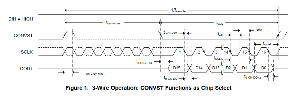 下面是我的测得波形,黄色为时钟clk,绿色为输出sdo。基准我接的2.5v,输出数据0x7xxx,因为我输入电压就是1.25v左右,所以接收到的数据是对的。