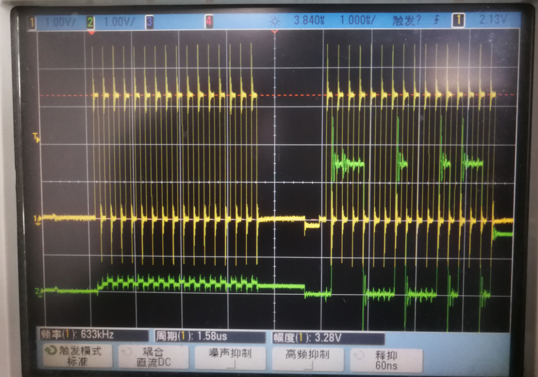 8分频或者4分频的时候,发现示波器测sdo引脚有数据的,但是spi得DR寄存器里面没有接收到数据,暂时还没有找到出现这种问题的原因,后面有时间再找这里的原因。