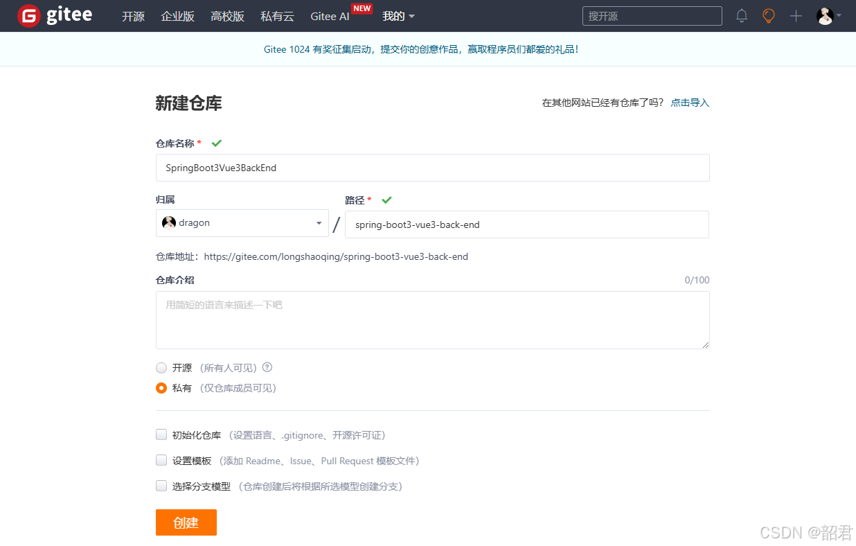 1.2.5 在创建新仓库时,默认选择初始化分支名为master