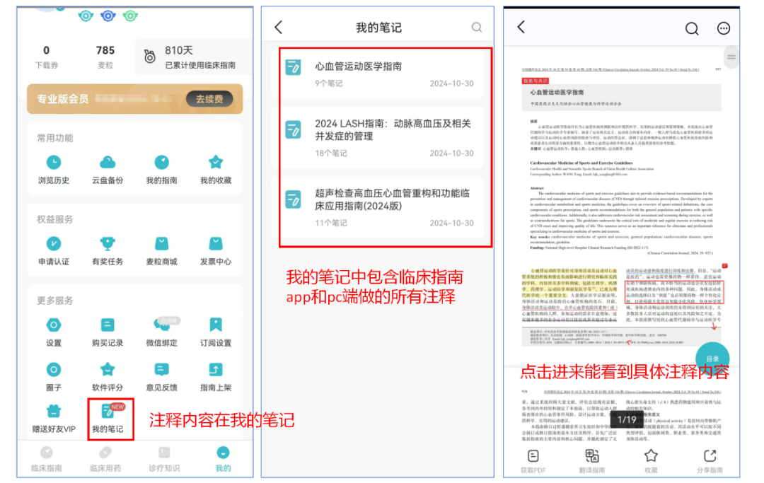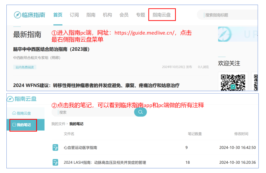 临床指南PC端(电脑访问:https://guide.medlive.cn/ 进入)的笔记功能更加丰富,等待你的探索,具体可参照下图: