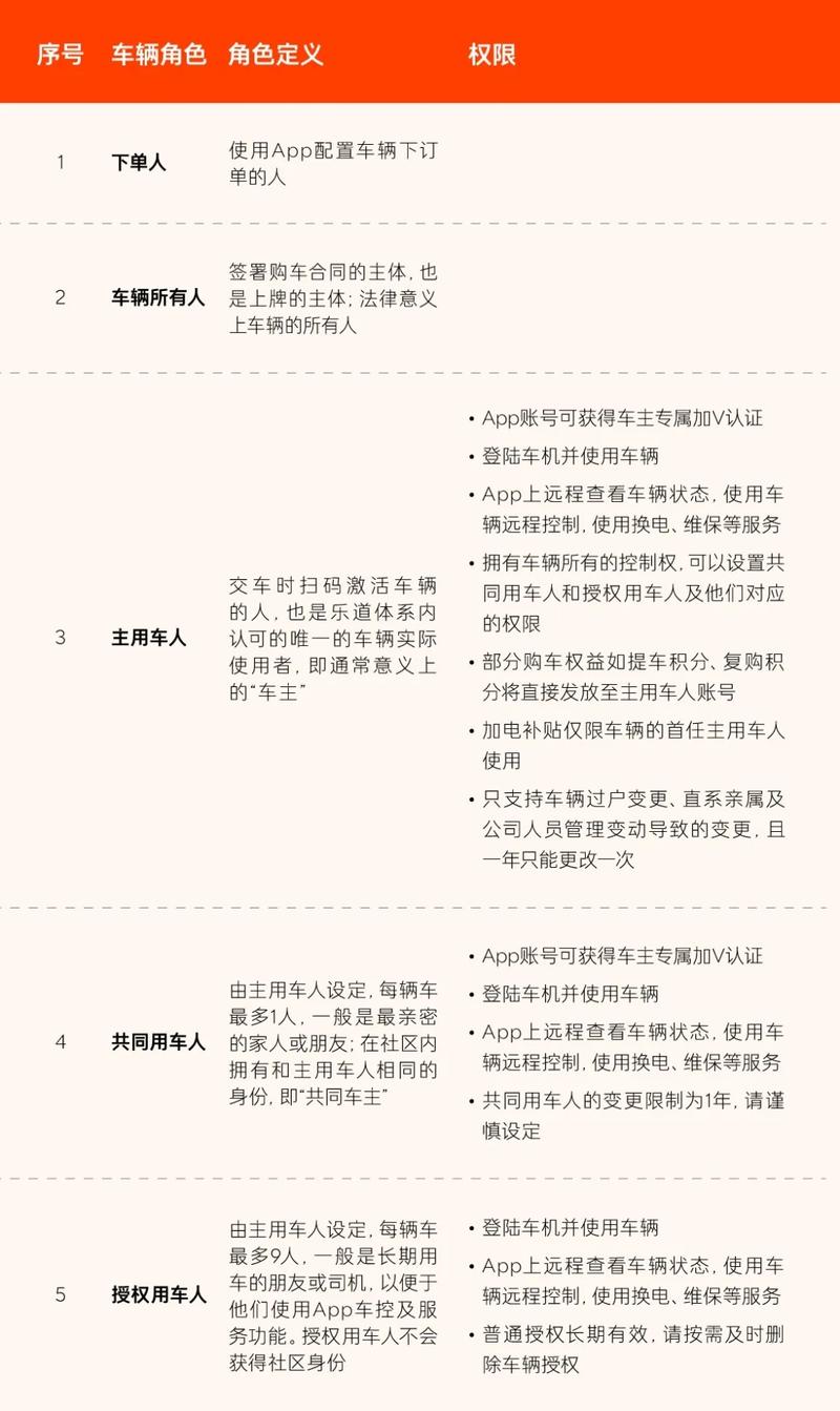 由于小乐的App账号内的加电补贴更多,一家人决定用小乐的账号作为主用车人激活,并设置妈妈的账号作为共同用车人。共同用车人与主用车人在车辆使用、手机控车功能、乐道服务上的体验一致,且在App内同样可获得车主V认证标识。那么此时,小乐和妈妈的用户身份如下: