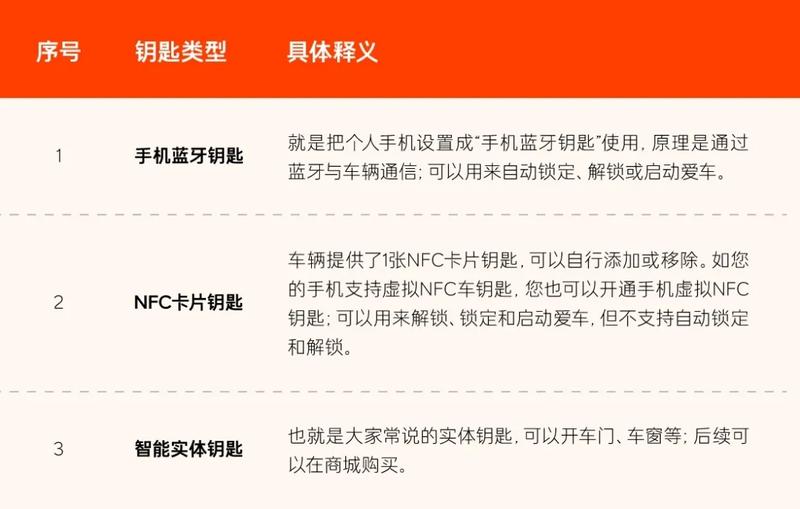 上期问必答我们提到过,目前 L60 提供三种解锁方式:蜂窝网络远程解锁、手机蓝牙钥匙、NFC 卡片钥匙,很多朋友还不是很熟悉这些有什么区别,今天就为大家解答一下。L60支持的钥匙类型、具体含义如下所示: