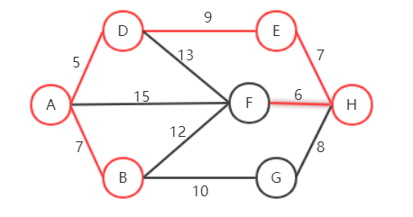 下一个顶点应选择离 A、D 权值最小的顶点,因此选择 AB 这条边。此时 A、D、B 为已选择顶点,E、F、G 为待选择顶点,H 为未选择顶点。