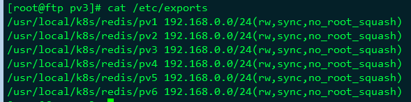 讯享网[root@ftp pv3]# cat /etc/exports /usr/local/k8s/redis/pv1 192.168.0.0/24(rw,sync,no_root_squash) /usr/local/k8s/redis/pv2 192.168.0.0/24(rw,sync,no_root_squash) /usr/local/k8s/redis/pv3 192.168.0.0/24(rw,sync,no_root_squash) /usr/local/k8s/redis/pv4 192.168.0.0/24(rw,sync,no_root_squash) /usr/local/k8s/redis/pv5 192.168.0.0/24(rw,sync,no_root_squash) /usr/local/k8s/redis/pv6 192.168.0.0/24(rw,sync,no_root_squash)