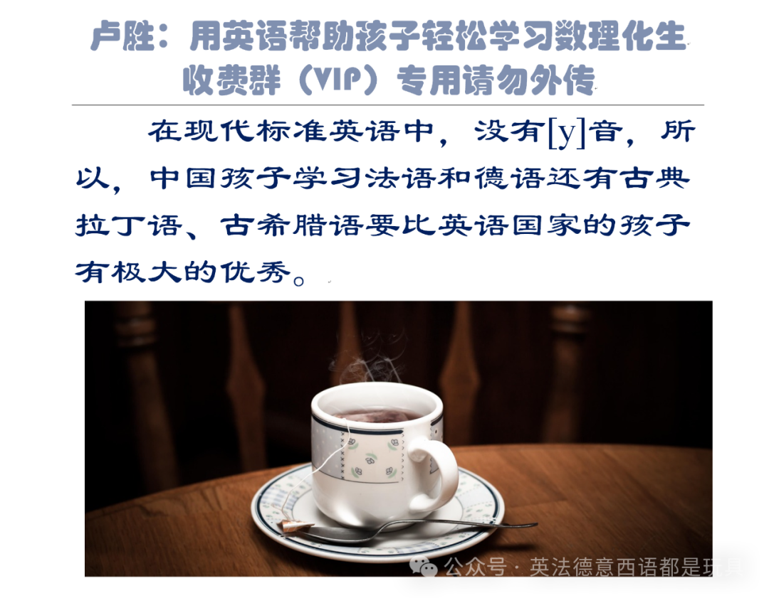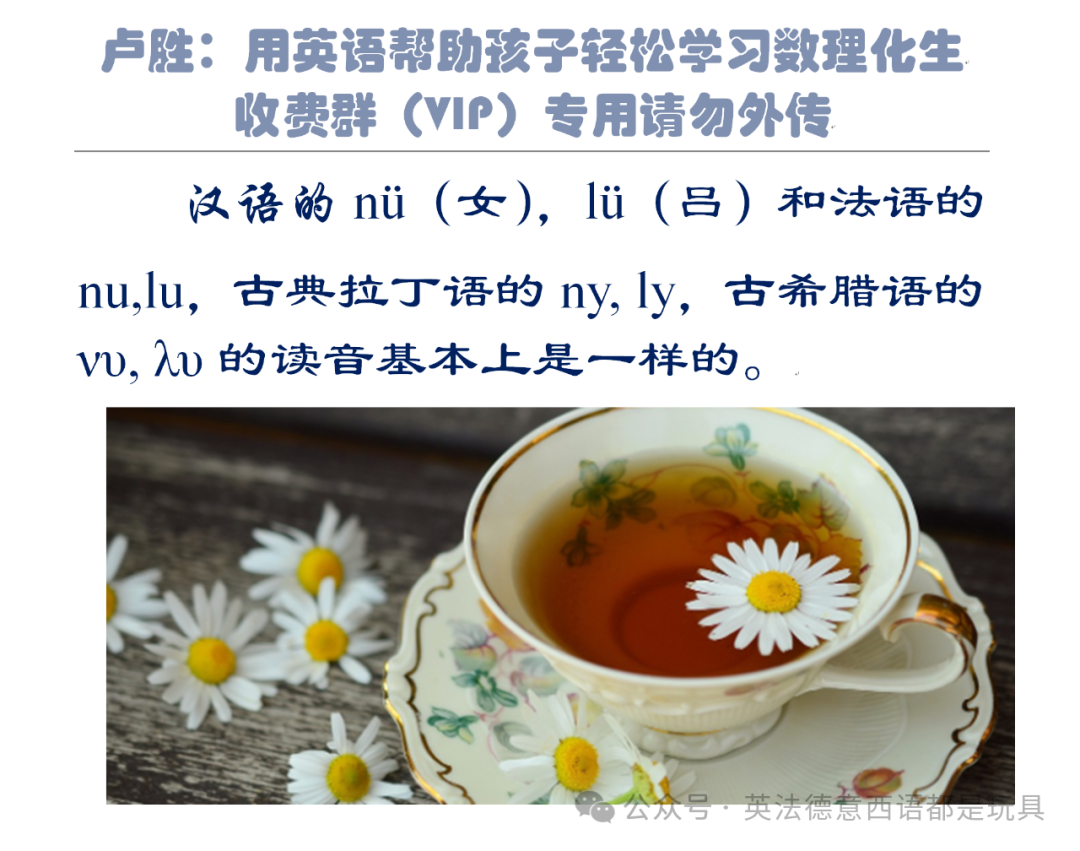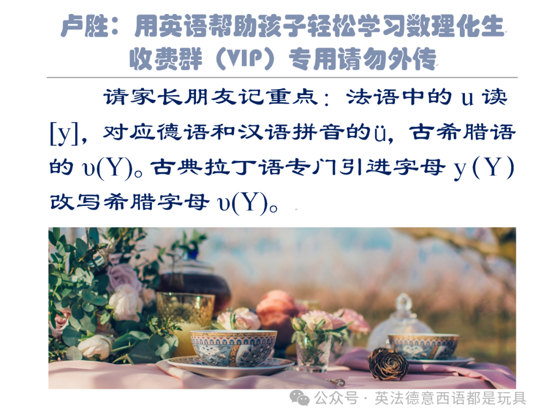 请家长朋友记重点:法语中的u读[y],对应德语和汉语拼音的ü,古希腊语的υ(Υ)。古典拉丁语专门引进字母y(Y)改写希腊字母υ(Υ)。
