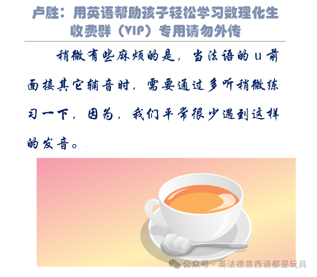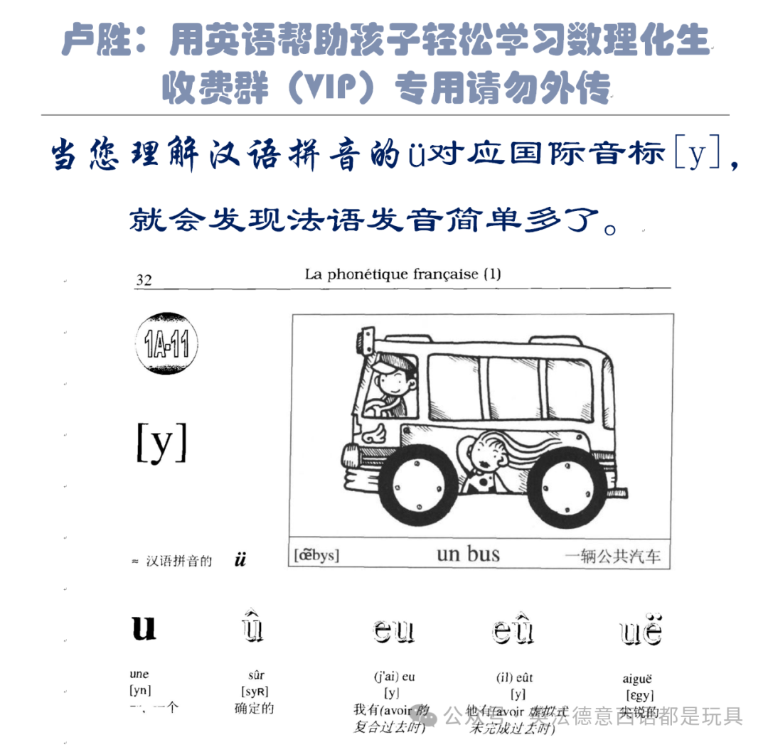 当您理解汉语拼音的ü对应国际音标[y],就会发现法语发音简单多了。