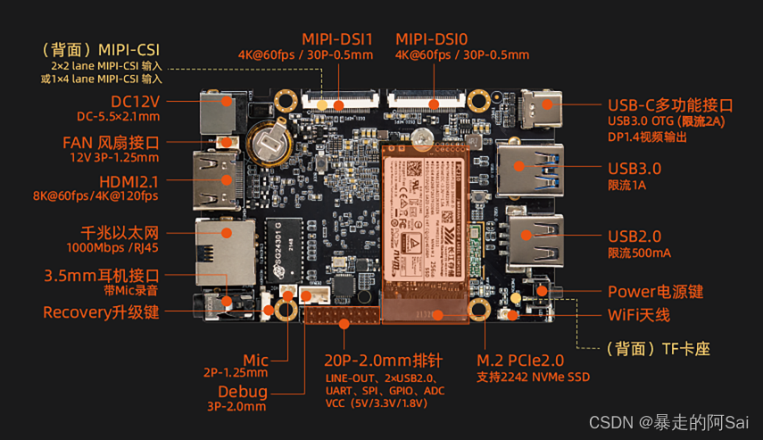 拥有MIPI-DSI、MIPI-DSI1、MIPI-DSI0、HDMI2.1、USB3.0、USB2.0、USB-C、M.2 PCIe2.0、千兆以太网等扩展接口。