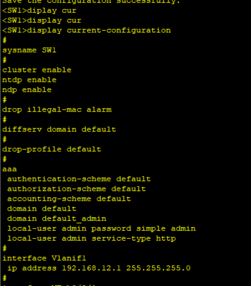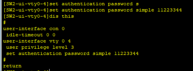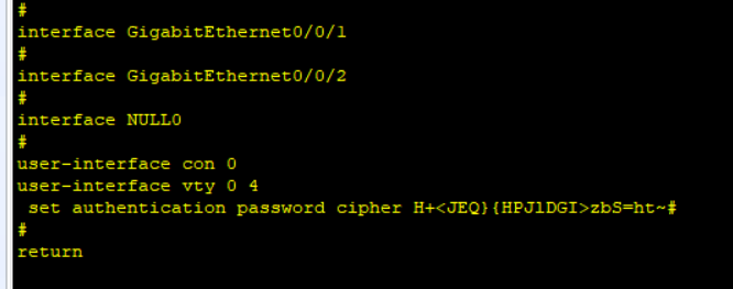 输入display current-configuration,查看当前数据配置,可以看到密码位置位加密的密码