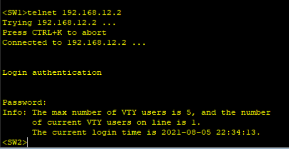 在用户视图下输入telnet再输入目标的IP地址,会让你输入密码,这个你输入之后是不可视的,正确后就可以控制另一个交换机。下面用远程把交换机密码改一下。