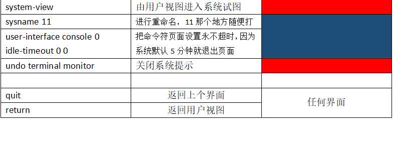 这个就是网络配置的不入门级别的连接方式,但是凡事都是由简入繁,越是基础,越是刚开始就要抓稳记牢,像是undo terminal monitor这个是关闭系统通知,user-interface console 0、idle-timeout 0 0 这两组组成的页面关闭时间设置为无,等等,这章的命令行都是基础中的基础,都需要抓紧记牢。