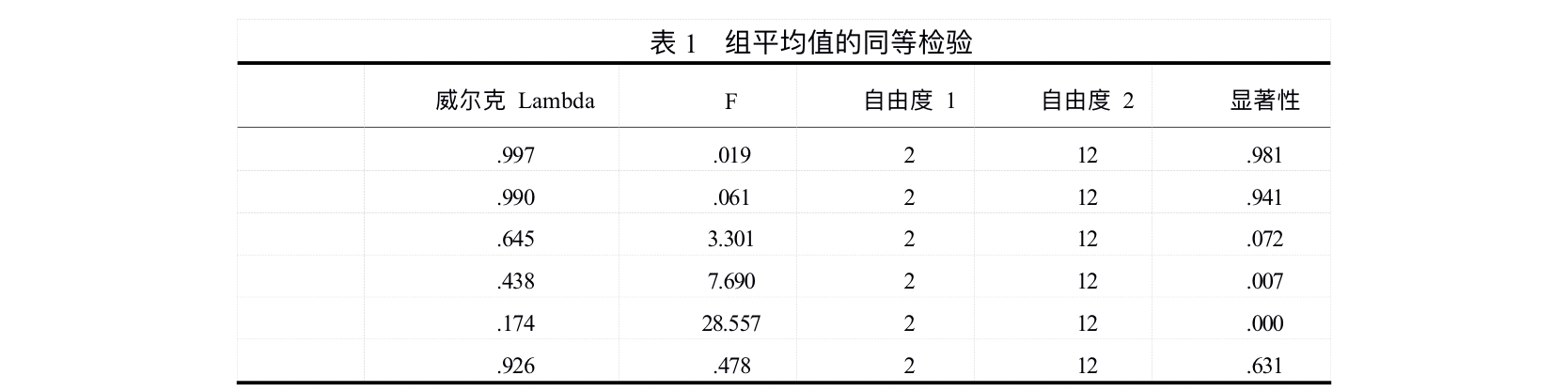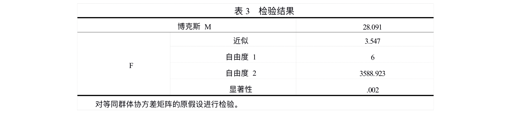 剔除变量、、,留下变量后重新运行得到表3,从表中可以看出,保留变量后,协方差阵是非奇异矩阵,F值对应显著性水平值为0.002,在显著性水平下,应拒绝原假设,认为各总体方差不相等。