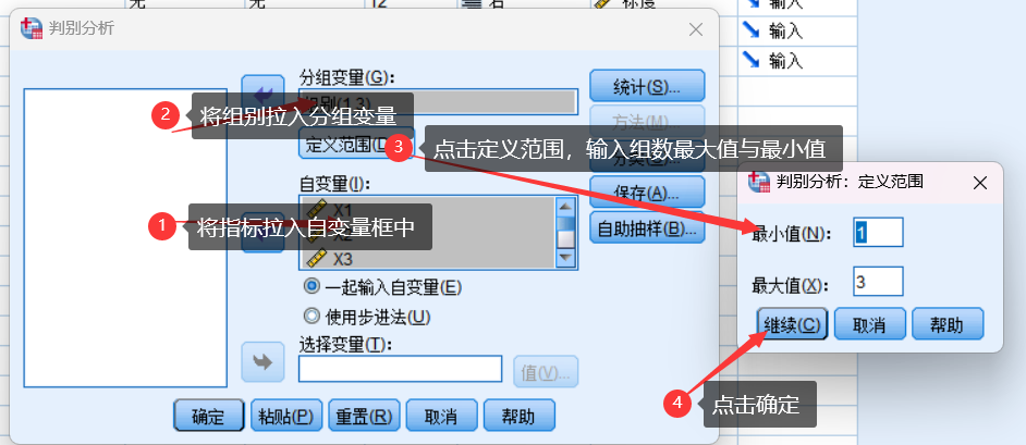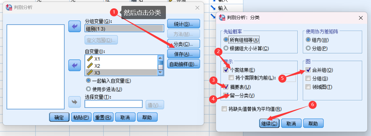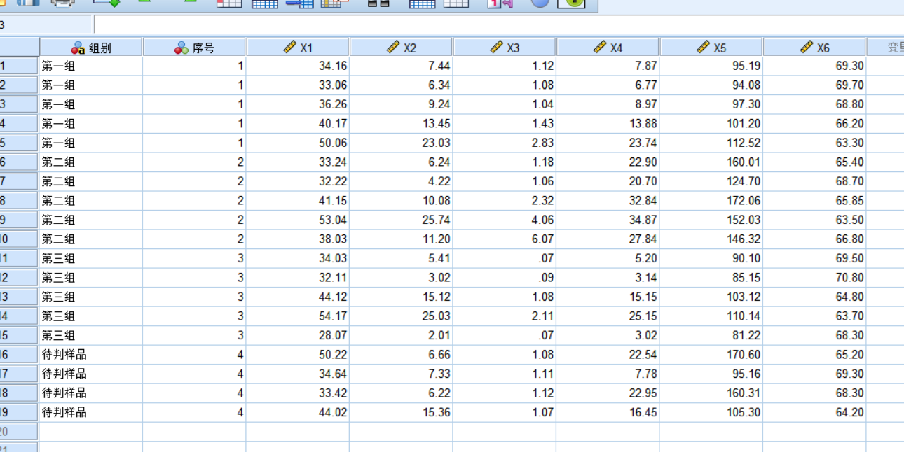 最后根据每个观测的判别Z得分对观测值进行分类,根据数据输出框输出结果可知,判断样本中1和3为第二组,2和4为第一组。其他样本中第二组中有一个,第三组中有两个被判错。