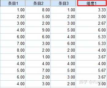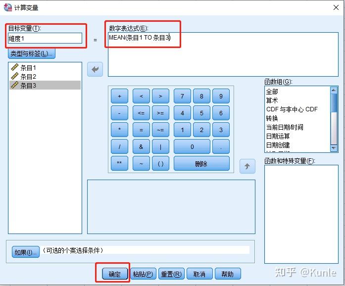 一种是:在菜单栏中选择“转换”下面的“计算变量”,在左侧目标变量中输入你要计算分数的名称,例如“维度1”,在右侧“数字表达”中,写出相应的计算公式,例如“mean(条目1, 条目2, 条目3)”或者“(条目1+条目2+条目3)/3”或者“mean(条目1 to 条目3)”,即可计算该维度的条目均分。
