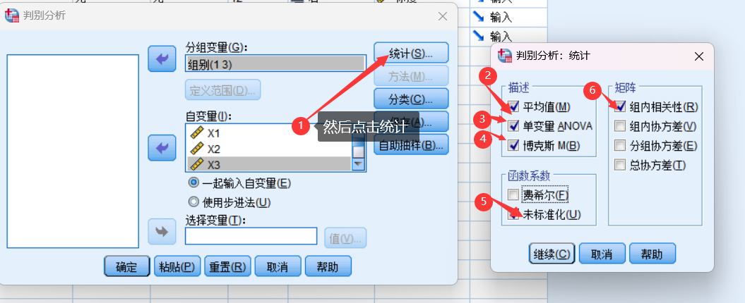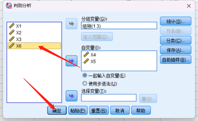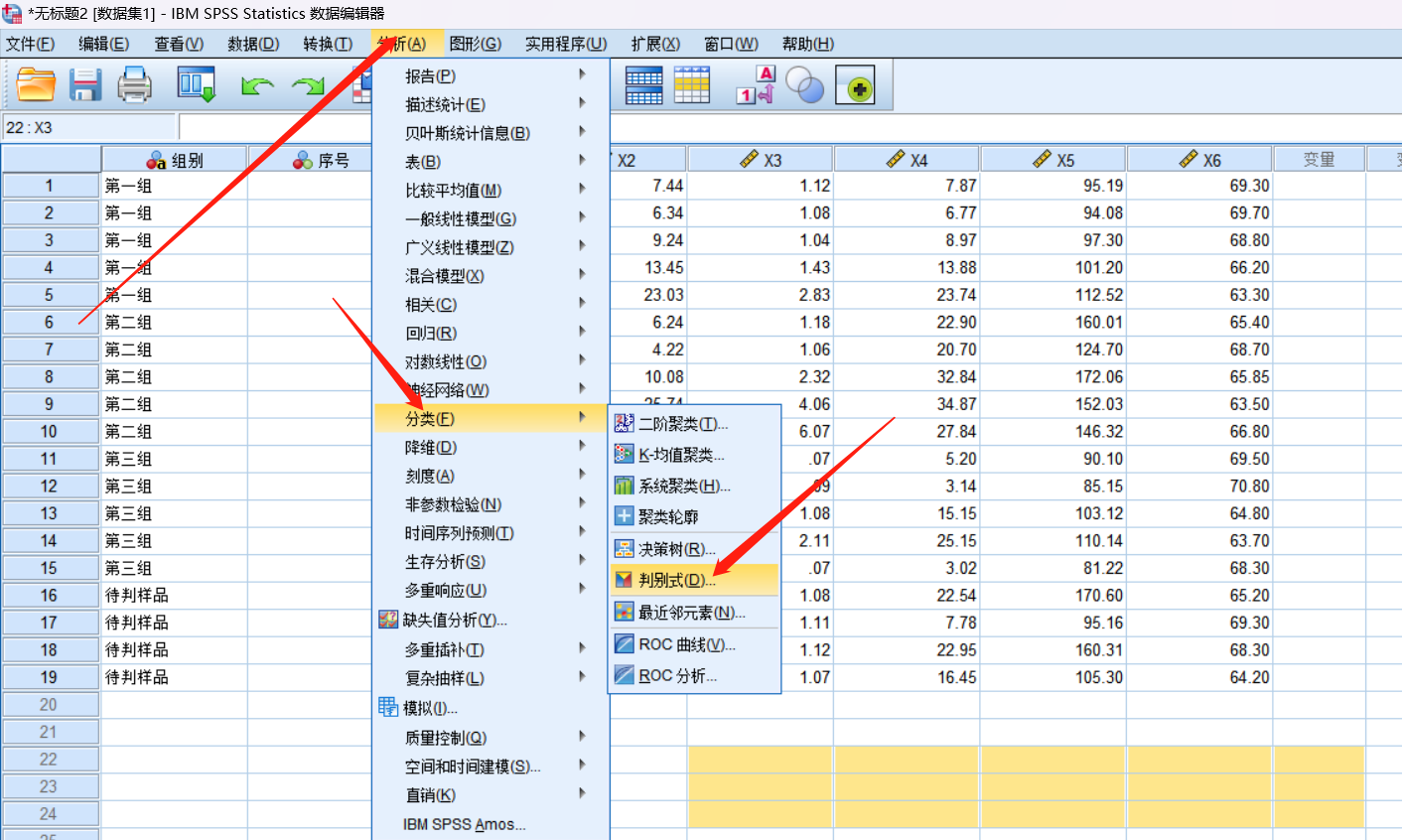 为判别另外4个样品的组别,选择Fisher判别法建立判别函数对其进行判别。