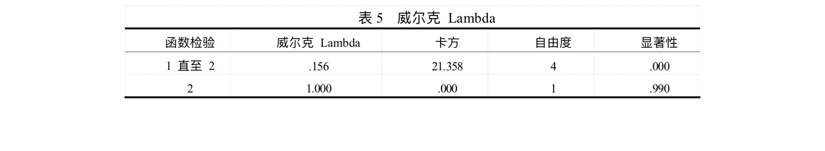 表4反映判别函数的特征值、解释总方差的比例、典型相关性。第一个判别函数解释了100%的方差,第二个判别函数未解释其方差。