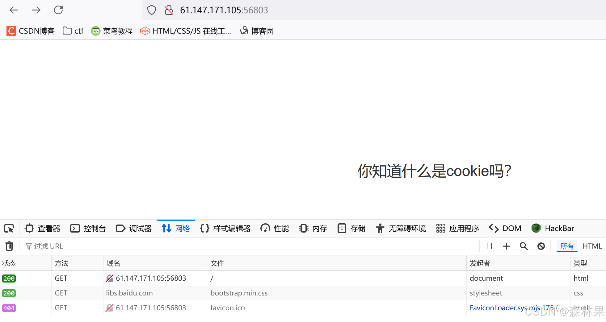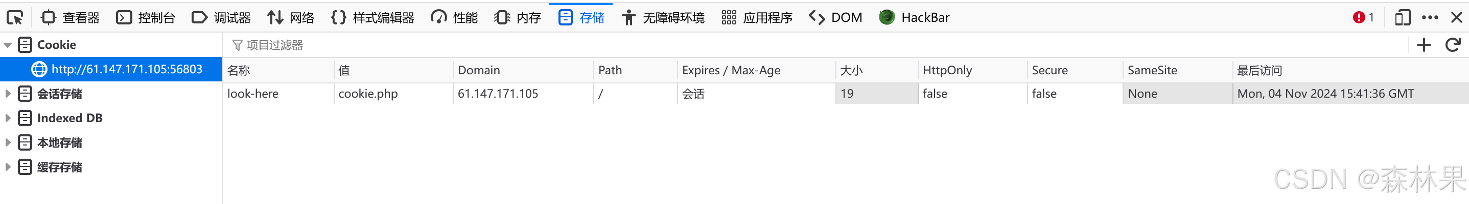打开网页,F12点击存储,看到cookie.php文件提示,访问