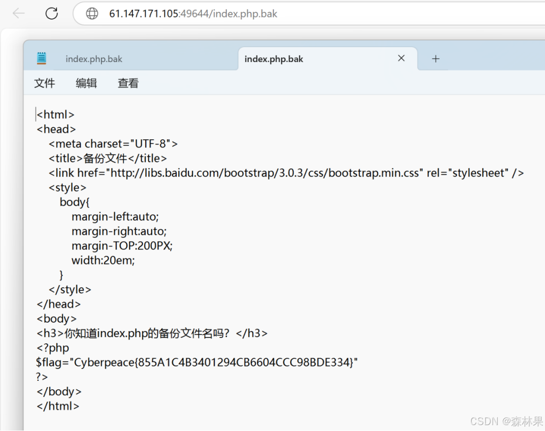 因此根据题目提示,此备份文件后缀为.bak,访问index.php.bak,生成文件,打开得到flag