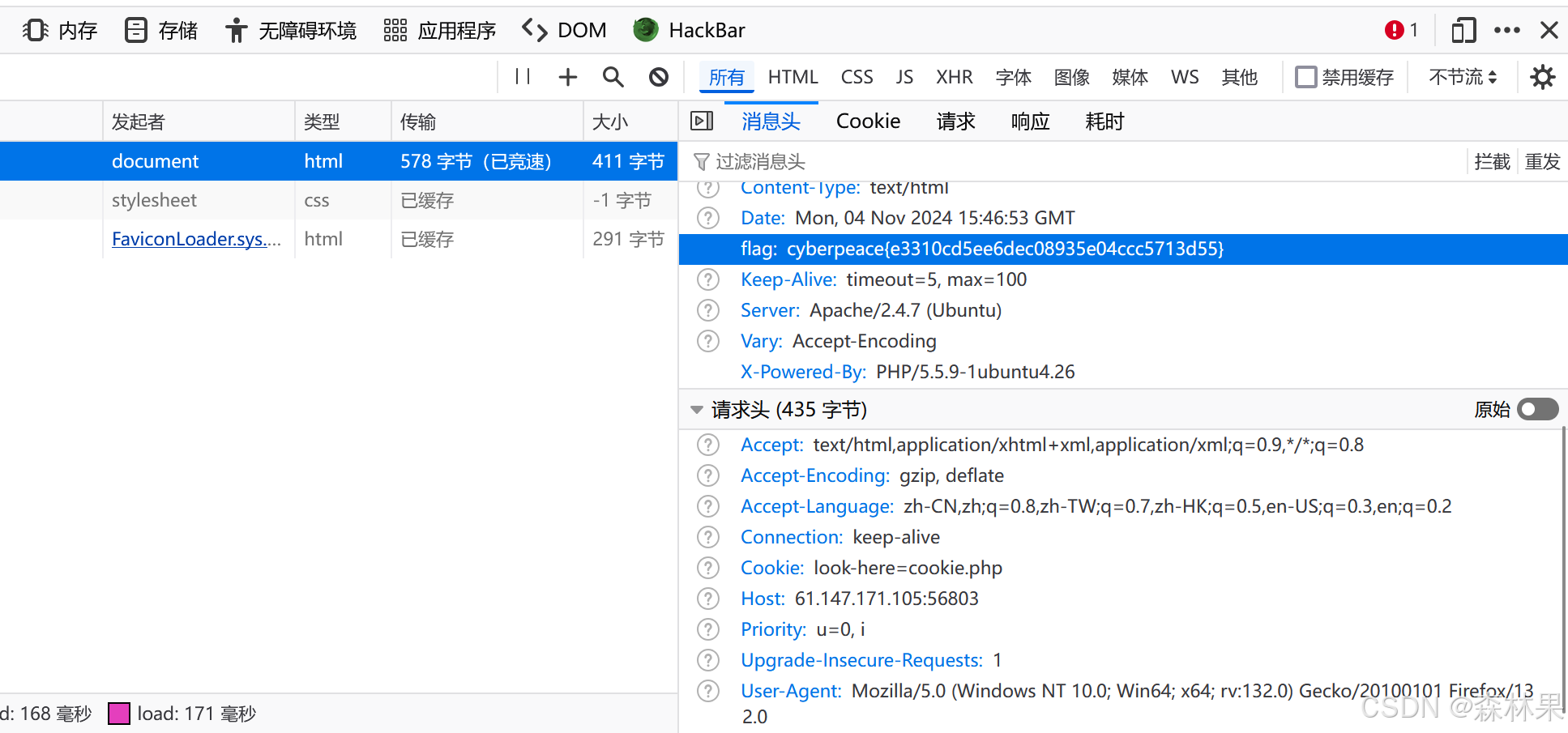 提示查看http回复,打开网络,再点击刷新,看见cookie.php,点开