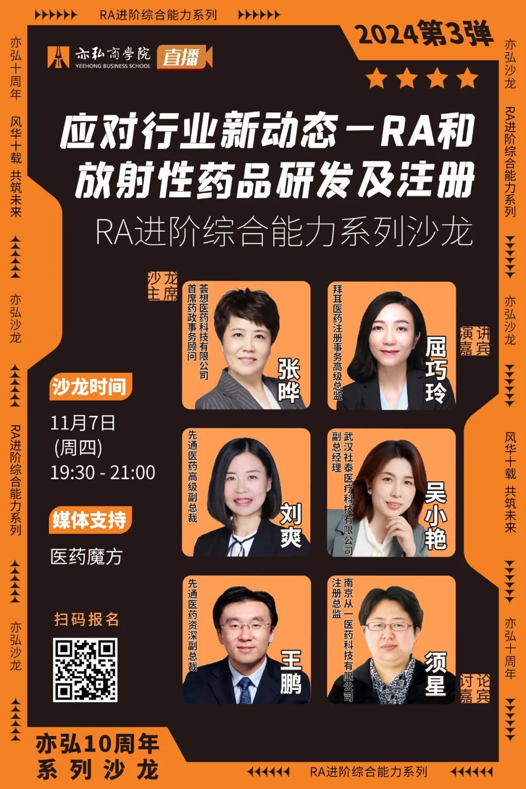 本期沙龙将围绕“应对行业新动态—RA和放射性药品研发及注册”,邀请《放射药品法规体系研究课题》骨干专家,从放药的特点及其与普药在注册中的区别、放药研发各阶段中RA应了解的特殊环节、放药研发过程中的跨部门协调合作、核药研发策略等,展开演讲与讨论,以提升RA综合能力为落脚点,希冀为放药领域的RA同仁奉献经验和洞见。