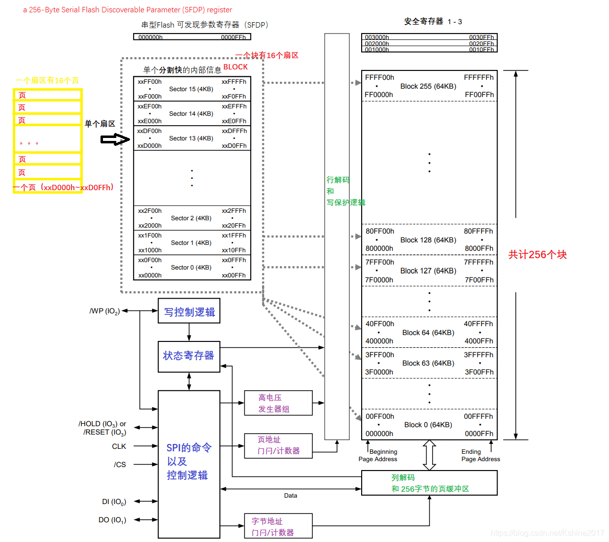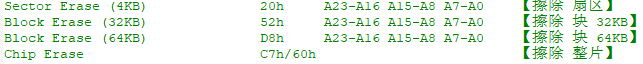 该存储器先划分为256个可擦除块。每个块可以划分为16个扇区,每个扇区4KB。每个扇区可以划分为16个页。每页256字节。