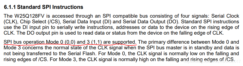 当SPI总线主机处于待机状态且数据未传输至串行闪存时,模式0与模式3之间的主要区别在于CLK信号的正常状态。
