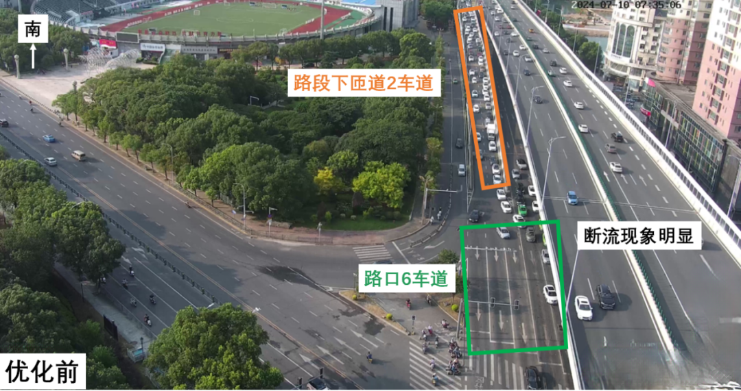 洪都北大道南京路南进口6条车道数远多于2条下桥车道,南口绿灯时间过长时,路口6条车道车辆消散速度远大于路段2条车道车辆到达速度,很容易导致断流。