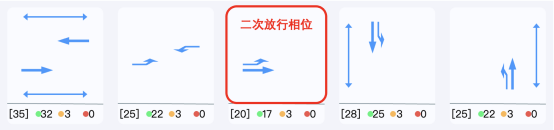 当进口车道数量多于路段车道数量时候,很可能就会导致路口出现“断流”、“绞死”现象。此时采用二次放行方式,可以将“蓄水”空间的进口多次“蓄水”后放行车辆。