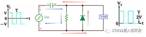下面是二极管结合电容实现的钳位电路。分析中不考虑二极管的导通压降,假设RC时间常数足够大,从而使输出波形不会失真。相关推荐:动画讲解二极管工作原理。