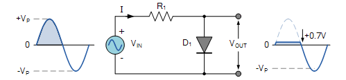 如下图所示,当在正半周期,并且VIN大于等于0.7V,二极管正向导通。此时,