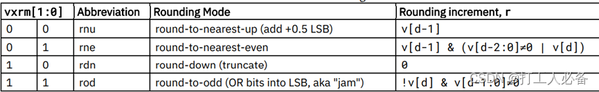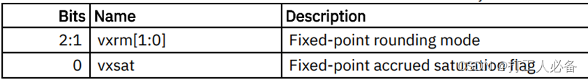 - 规定向量定点舍入模式,只有低2bit为有效位,有符号无符号均满足相同的舍入方式,可读可写