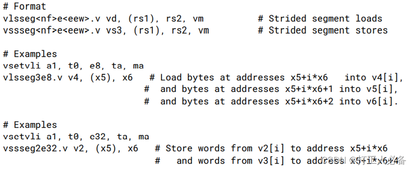- vlse/vsse+bit.v vd/vs3, (rs1), rs2, vm : 恒定步幅连续寻址 rs2中存储的是有符号步幅增量