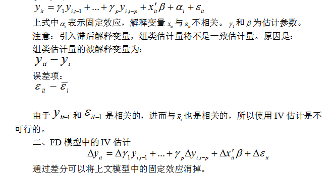 与静态模型进行比较,一阶差分数据的OLS模型回归将不能够得到一致的参数估计,即使不存在序列相关问题,因为与存在相关性。对于存在序列相关的,固定效应模型的误差项和是相关的,因为取决于。但是对于k>=2时,和是不相关的,因此也就可以使用IV进行估计,即将作为内生解释变量,更多滞后期作为其工具变量,则开启了工具变量估计的可能性。