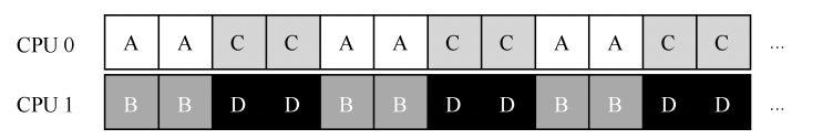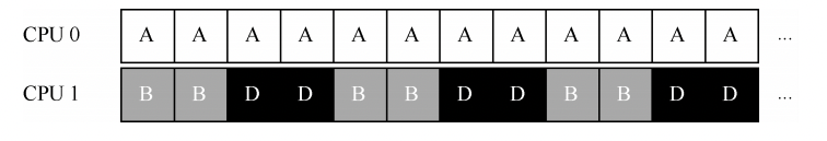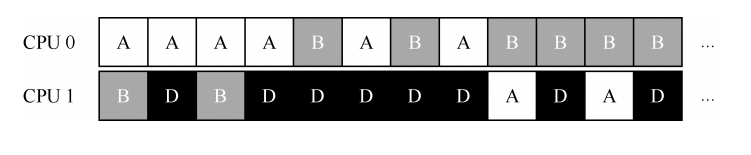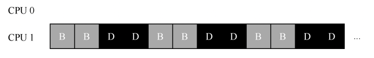 如何解决负载不均的问题呢?答案是不断地迁移一个或多个工作。一种可能的解决方案是不断切换工作,如下面的时间线所示。可以看到,开始的时候 A 独享 CPU 0,B 和 D 在 CPU 1。一些时间片后,B 迁移到 CPU 0 与 A 竞争,D 则独享 CPU 1 一段时间。这样就实现了负载均衡。