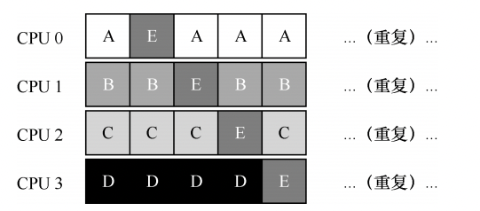 这种调度中,A、B、C、D 这 4 个工作都保持在同一个 CPU 上,只有工作 E 不断地来回迁移(migrating),从而尽可能多地获得缓存亲和度。