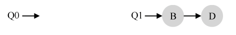 从图中可以看出,A 获得了 B 和 D 两倍的 CPU 时间,这不是期望的结果。更糟的是, 假设 A 和 C 都执行完毕,系统中只有 B 和 D。调度队列看起来如下: