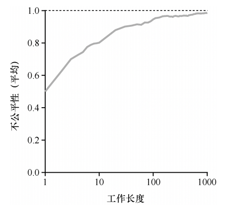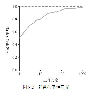 假设有两个互相竞争工作的完成时间,每个工作都有相同数目的 100 张彩票,以及相同的运行时间 R。这种情况下,我们希望两个工作在大约同时完成,但由于彩票调度算法的随机性,有时一个工作会先于另一个完成。为了量化这种区别,我们定义了一个简单的不公平指标 U(unfairness metric),将两个工作完成时刻相除得到 U 的值。如果两个工作几乎同时完成,U 的值将很接近于 1。在这种情况下,我们的目标是: 完美的公平调度程序可以做到 U=1。下图展示了当两个工作的运行时间从 1 到 1000 变化时,30 次试验的平均 U 值。可以看出,当工作执行时间很短时,平均不公平度非常糟糕。只有当工作执行非常多的时间片时,彩票调度算法才能得到期望的结果: