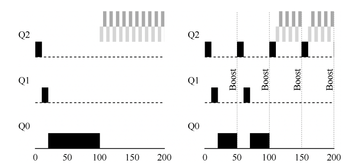 下面是一个长工作与两个交互型短工作竞争 CPU 时的行为。左边没有优先级提升,长工作在两个短工作到达后被饿死。右边每 50ms 就有一次优先级提升(这里只是举例,这个值可能过小),因此至少保证长工作会有一些进展,每过 50ms 就被提升到最高优先级,从而定期获得执行。