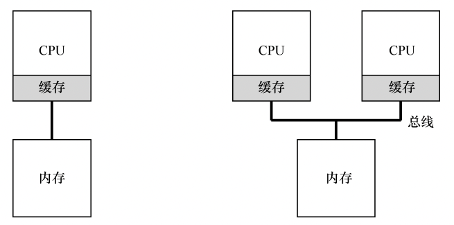 缓存一致性(cache coherence)问题:假设一个运行在 CPU 1 上的程序从内存地址 A 读取数据。由于不在 CPU 1 的缓存中,所以系统直接访问内存,得到值 D。程序然后修改了地址 A 处的值,只是将它的缓存更新为新值 D’。将数据写回内存比较慢,因此系统(通常)会稍后再做。假设这时操作系统中断了该程序的运行,并将其交给 CPU 2, 重新读取地址 A 的数据,由于 CPU 2 的缓存中并没有该数据,所以会直接从内存中读取, 得到了旧值 D,而不是正确的值 D‘。