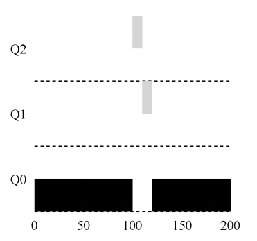 下面的例子,两个长工作在高优先级队列执行 10ms,中间队列执行 20ms,最后在最低优先级队列执行 40ms: