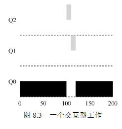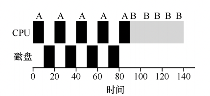 第三个例子:交互型工作 B(用灰色表示)每执行 1ms 便需要进行 I/O操作,它与长时间运行的工作 A(用黑色表示)竞争 CPU: