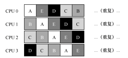 一段时间后,假设每个工作依次执行一个时间片,然后选择另一个工作,下面是每个CPU 可能的调度序列: