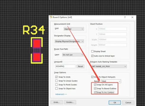 如图所示,勾选“Snap On All Layers”、“Snap To Board Outline”、“Snap To Arc Centers”,最后点击“OK”按钮;