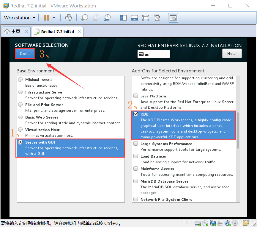 选择左侧GUI图形化界面,右侧点击KDE,最后点击完成。完成之后,退回界面需要等待几秒钟。