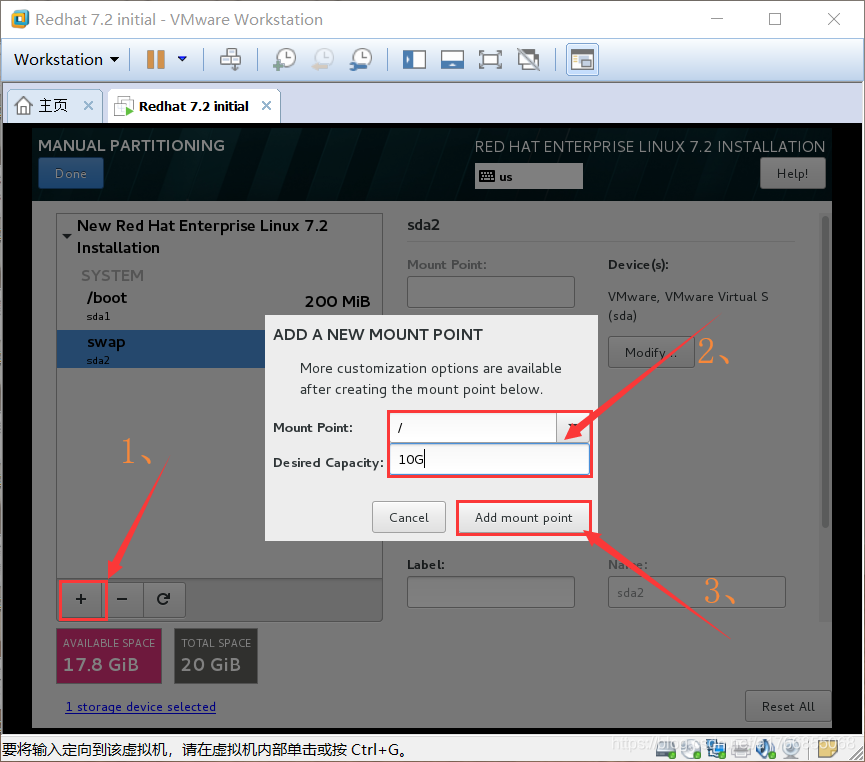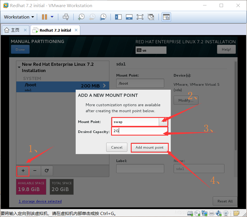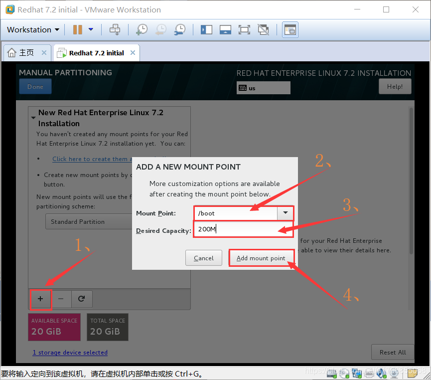 (3)点击“+”添加一个boot挂载点,boot相当于我们的开机启动引导,紧接着设置大小为200M。最后点击添加挂载点。