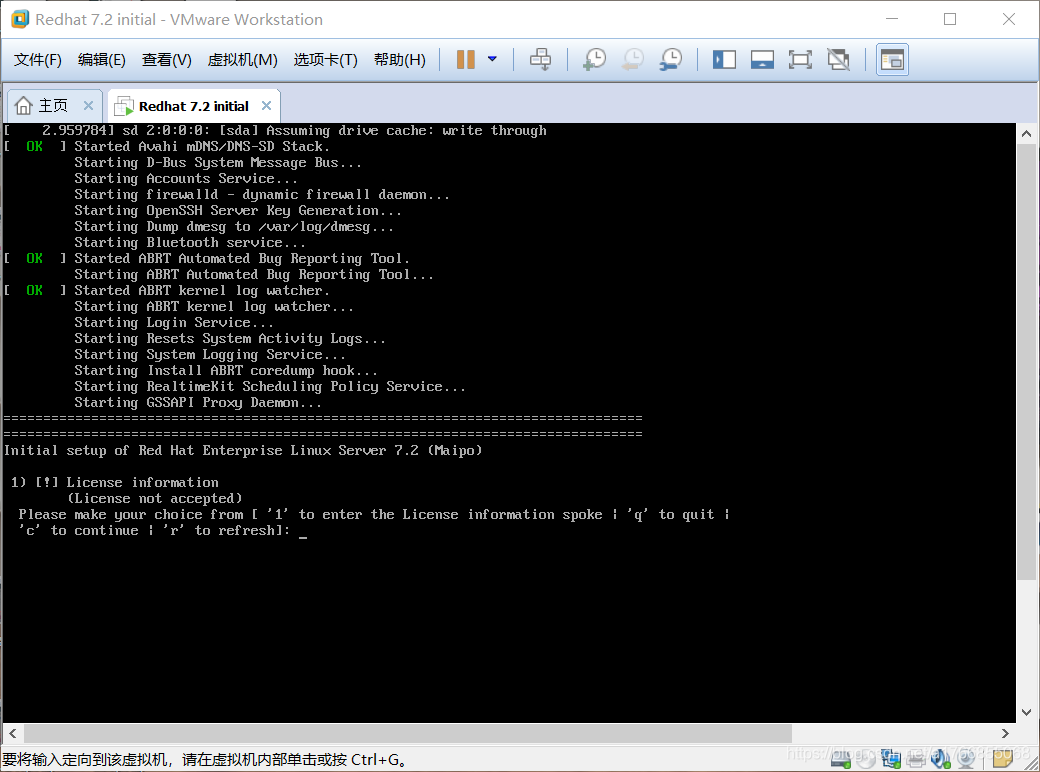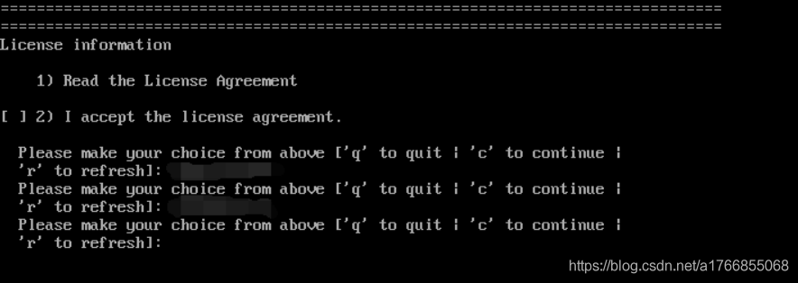 2、然后选择2回车,表示接受许可,如果摁错了没关系,直接按回车,它会让你重新输入,之后继续即可重启。