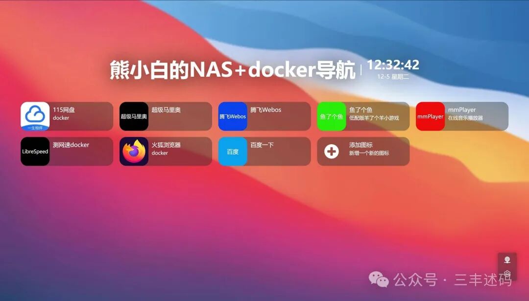 上图为浏览器打开之后的效果,可以自己修改导航页的名称,能够显示时间、日期,中间区域则是小白自己创建的导航图标,除了可以编辑自己常用的网站之外,还能将NAS里面的其他docker镜像也挂在这个页面,并且支持弹窗显示操作,这样就能在一个网页下直接打开其他的docker镜像了。