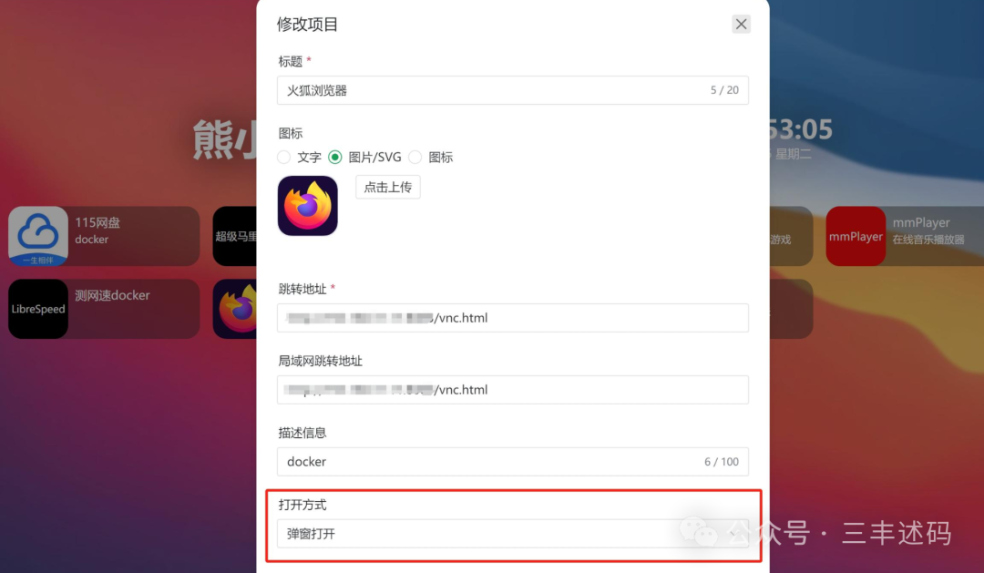 想要在这个导航页,以弹窗打开网站和docker容器的话,在编辑界面,将打开方式更改为“弹窗打开”即可,如下图所示。