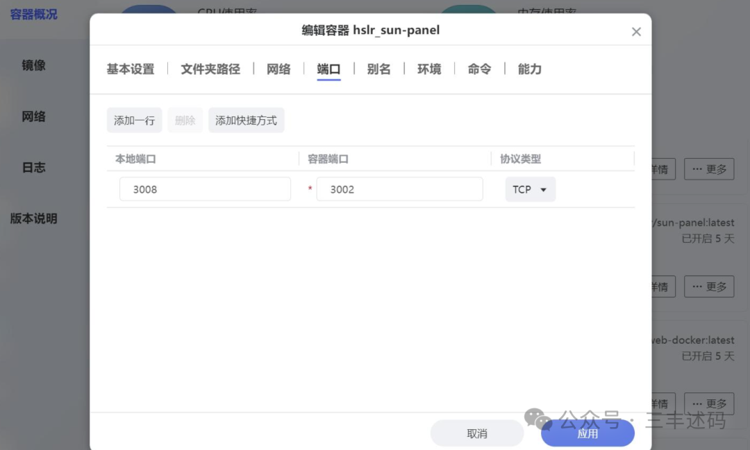 c、端口,容器端口为3002,这个不要改,给它安排一个本地端口就行了。