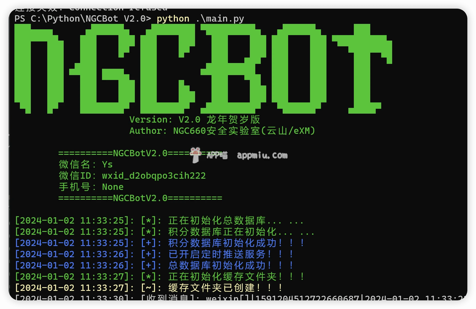 NGCBot 支持安全新闻定时推送【FreeBuf,先知,安全客,奇安信攻防社区】,Kfc文案,备案查询,手机号归属地查询,WHOIS信息查询,星座查询,天气查询,摸鱼日历,微步威胁情报查询, 美女视频,美女图片,帮助菜单。 支持积分功能,支持自动拉人,检测广告,自动群发,Ai回复,自定义程度丰富,小白也可轻松上手!