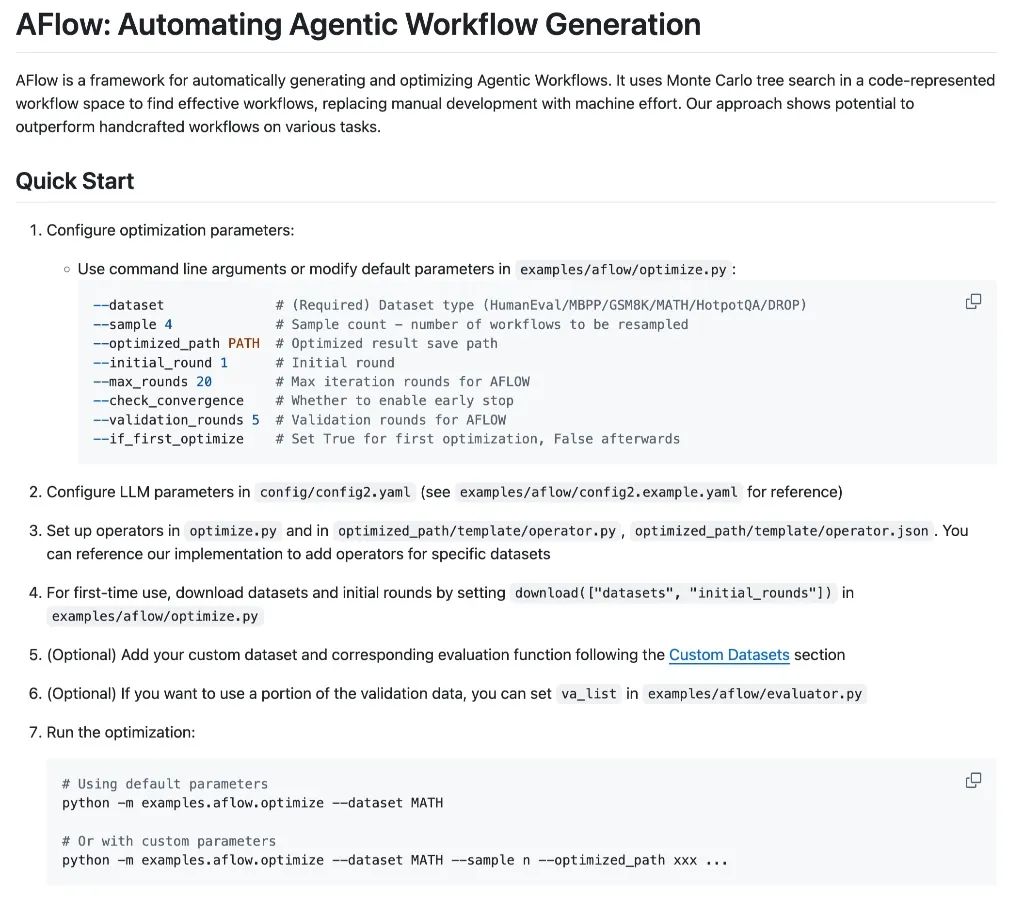 MetaGPT 开源了 AFLOW,它使用 MCTS 进行 Agentic Workflow 的自动搜索,可以完全自动地构建与优化 Agentic Workflow 问题,让我们不再需要手写代码、调试提示词。